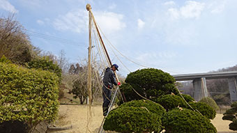 前回このコーナーで三春の雪景色をお伝えしたところ、あの後もさらに積雪があり、春がどんどん遠ざかる気がしておりました。でも、そんな雪も消え、つい先日は、三春工場に春の訪れを告げる伽羅木の雪つりの取り外し作業が行われました。北風はまだまだ冷たいですが、いよいよ三春に春が来ましたぁ~♪