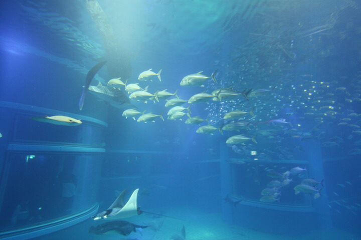 観覧コースは、最上層の階からこの大水槽をぐるぐると周りながら下層へ降りて行くようになっていて、悠々と泳ぐジンベエザメやイトマキエイ、その周りを泳ぐほかの魚たちを立体的にいろんな角度で楽しく観察することができます。