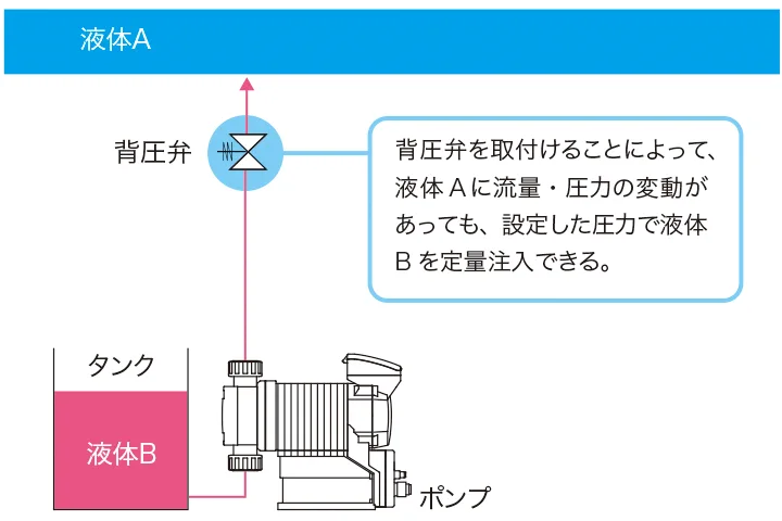 たとえば、液体Aの中にさらに液体Bをポンプで押し込んでミックスする場合があったとします。ここで背圧弁を設置し、液体Aの2倍以上の圧力設定をしておくと、Aの流れが速かろうが遅かろうが、また、多かろうが少なかろうが、常に設定した圧力をかけて、規定量を安定して注入することができるのです。