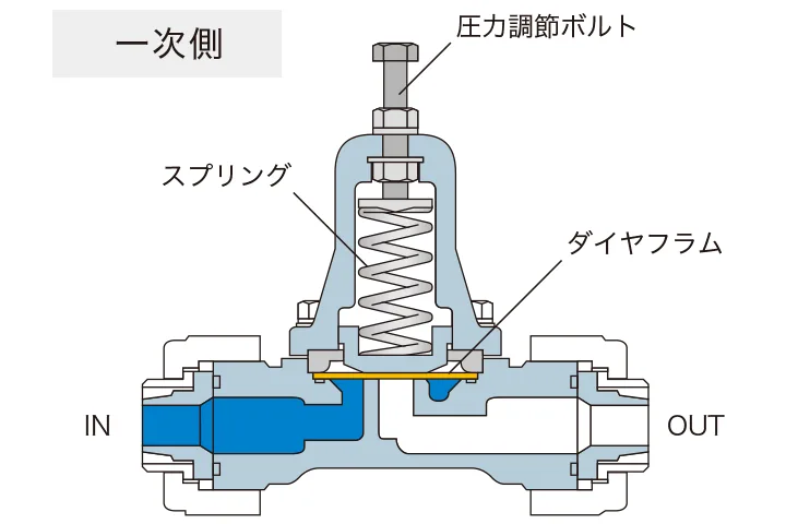 圧力調整ボルトで、任意に圧力を設定。スプリングでダイヤフラムを押さえつけているので、慣性によるオーバーフィード現象を防止できます。
