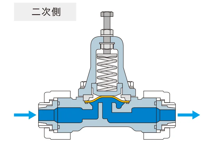 背圧弁の手前(1次側)の配管内部の圧力がスプリングで押さえつけている力を上回り、ダイヤフラムが開いて定量の液が流れます。