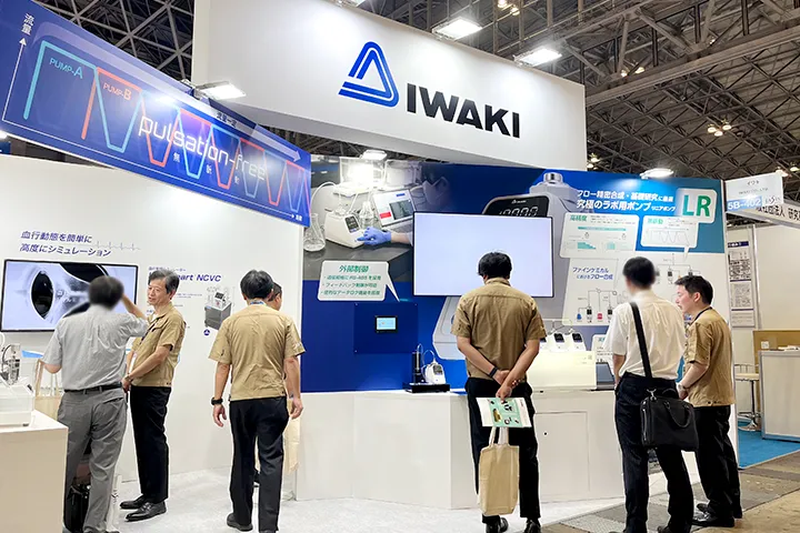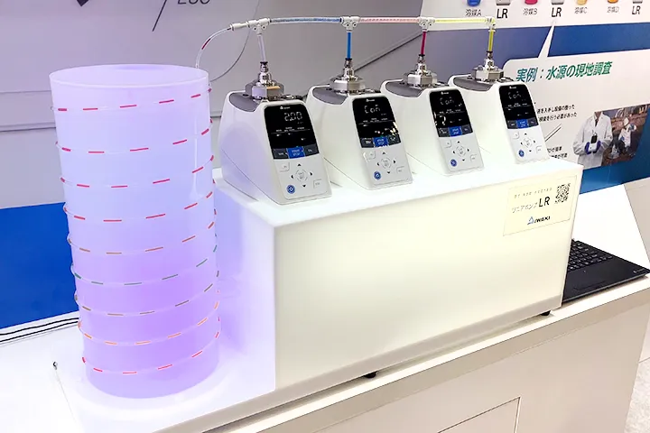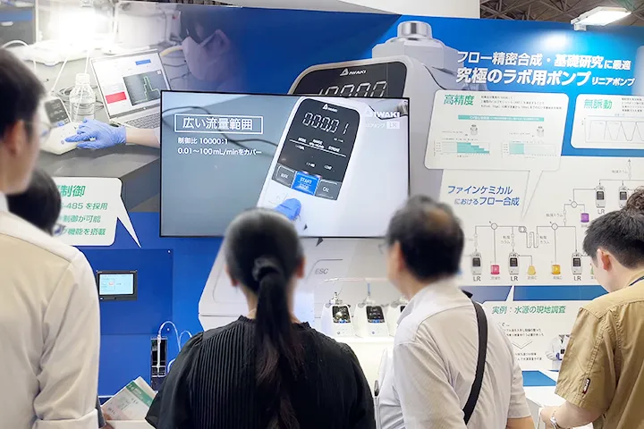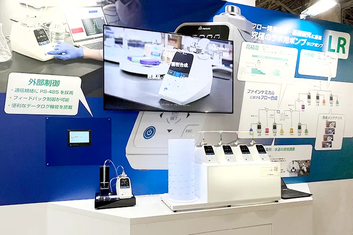 リニアポンプ LRは、無脈動での連続送液が可能な高機能ポンプです。フロー精密合成を想定した実演として、3色の色素の混合液とシリコンオイルを等間隔に送液するデモ装置を展示。優れた制御性と送液精度により、色素の繊細な混色を調整しました。また、便利な外部制御機能を搭載。RS-485通信規格の採用により、複数のLRを一つのプログラムで自由に設定・操作できます。