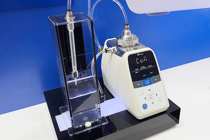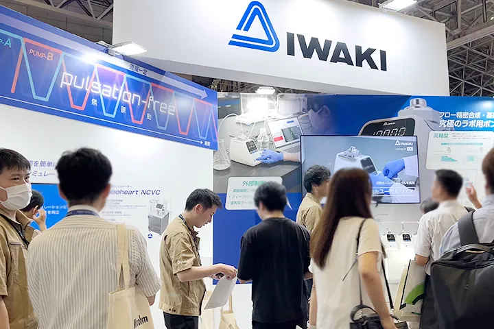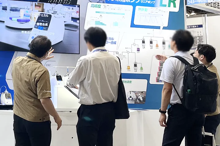 バルブレス構造により、エアーロックのトラブルがないハイセラポンプ V。実演では、微少量の液体を高精度に注入する様子をご覧いただきました。装置組み込み用のV-05/07は、流量可変機能を搭載。洗浄ポートを選択すれば、プランジャ表面をクリーンな状態に維持して、薬液注入できます。