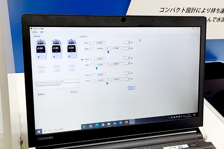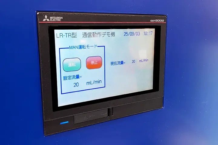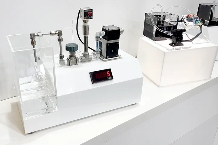 リニアポンプ LRはフィードバック制御も可能です。上位側にセンサを取り付けたデモ装置も展示し、設定流量と実流量の比較を行いました。