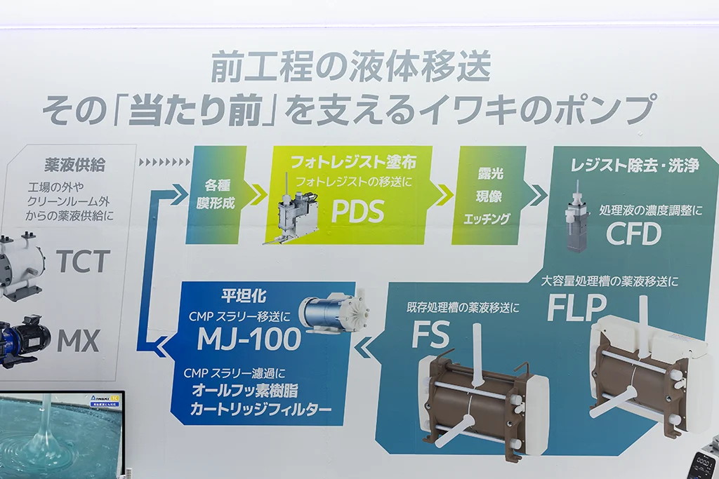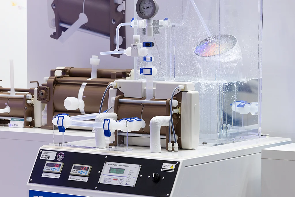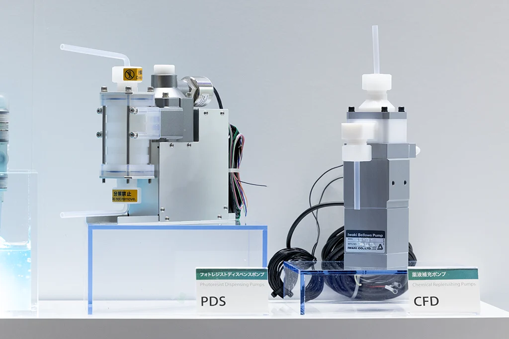 ウェハー洗浄液の濃度管理を高精度に行える薬液補充ポンプCFDを展示しました。洗浄液のコストダウンにも貢献します。
