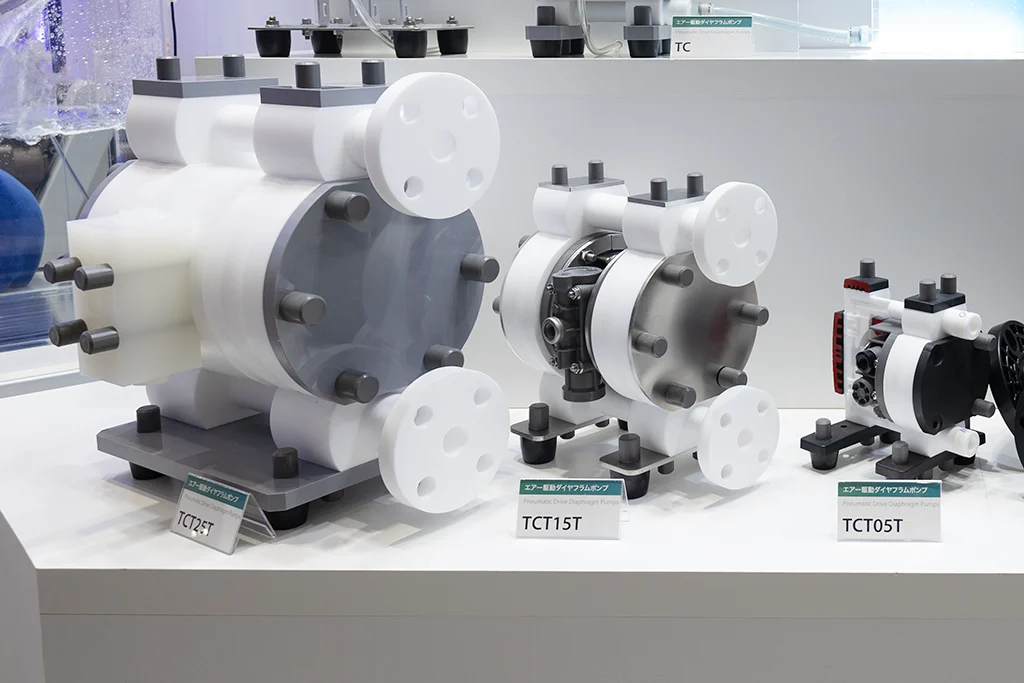 フッ素樹脂タイプのエアー駆動ダイヤフラムポンプTCを実演展示しました。洗浄装置の循環用やCMPスラリー液の移送用、さらには高純度薬液の供給用まで幅広く使用できます。