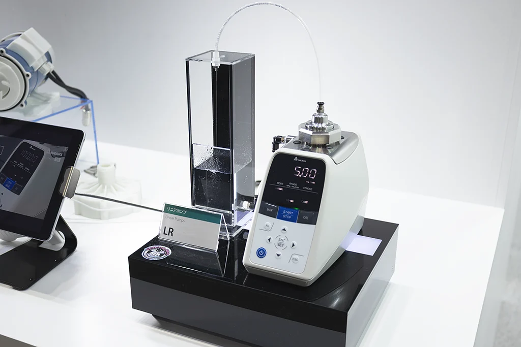 新製品として、パイロットプラントやテスト環境での送液に最適なリニアポンプLRを実演展示しました。