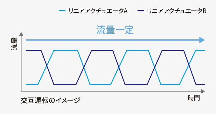2つのリニアアクチュエータの動きをずらし、動きの一部を重ねて往復動することで、一定の流量で脈動を抑えた運転を行います。