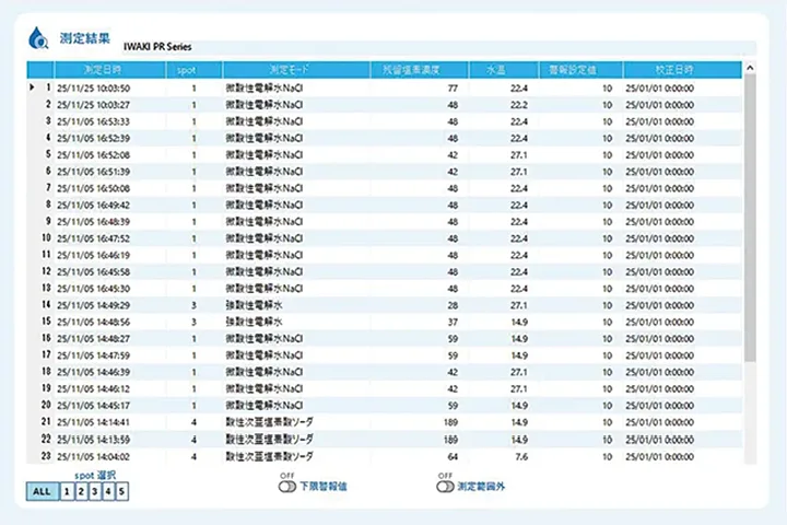| 測定モード | 微酸性電解水 NaCl 注1 | 微酸性電解水 HCl 注1 | 強酸性電解水 | 酸性次亜塩素酸ソーダ 注2 | 次亜塩素酸ソーダ 注2 |
